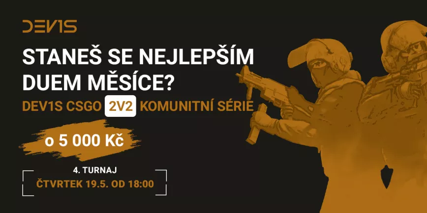 | Čtvrtek 19. května od 18:00 | DEV1S CS:GO 2v2 komunitní turnaj #4 |
